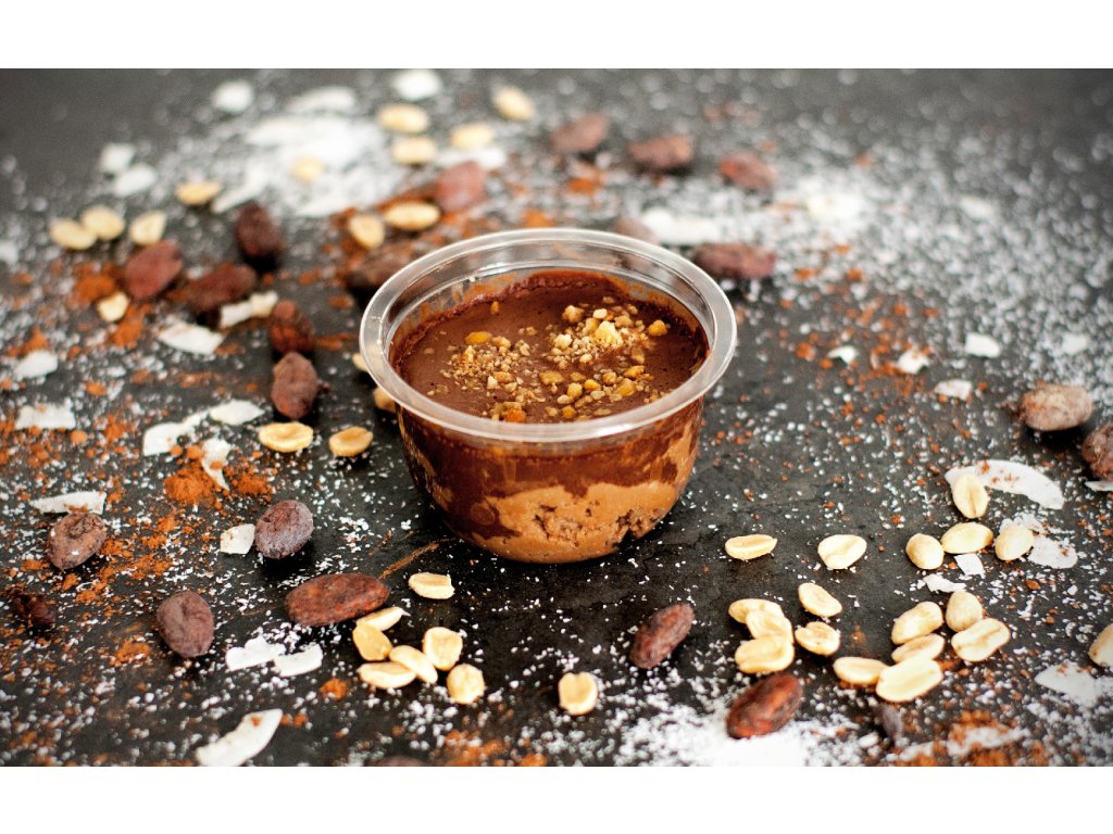 Jemný, krémový, nadýchaný čokoládovo-arašídový dezert vyrobený pouze z rostlinných surovin.